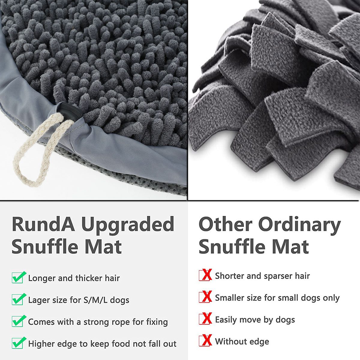 【Thicker Hair & Strong Edge Protection】Longer and thicker hair help you to hide the food better, the edge guard prevent food drop out from the mat. A wonderful snuffle mat can encourage dogs’ natural instinct, let them have fun exploring.